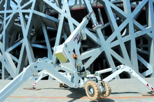 昨日,工作人员利用“蜘蛛车”清理北京“鸟巢”外围钢结构。当日,从意大利引进的一台高空清洗机械“蜘蛛车”开始对“鸟巢”外围钢结构进行清洗作业测试。该车酷似蜘蛛,价值400万,可自行“行走”,高度zui大可达48米。新华社发
