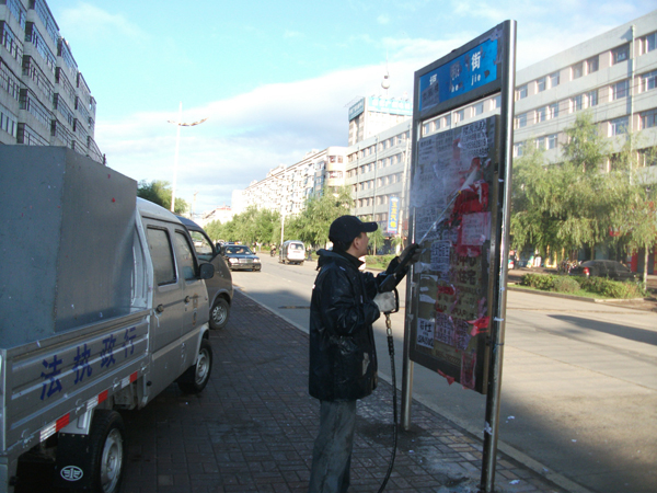 图为19日清晨,*执法局工作人员利用专业广告清洗机,对绥化七中路边的广告牌进行清洗。