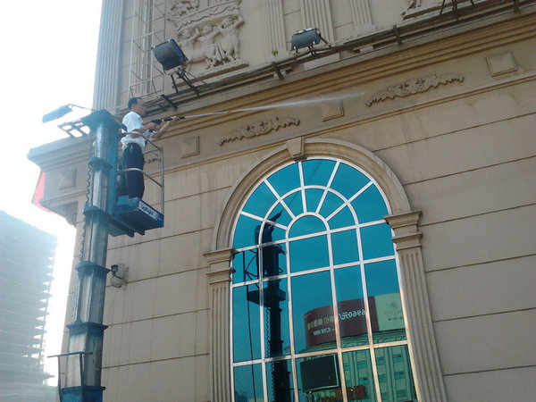 由于高度限制,工作人员带上喷水枪搭乘升降机到高空中喷水清洗。