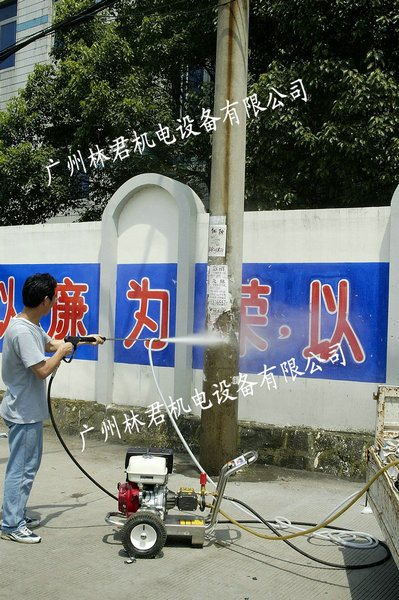 街头小广告是城市管理的“顽疾”,原来清理街头小广告,一般采用人工清擦或白石灰覆盖的办法来清除,但人工清理起来太费时,且用石灰覆盖又容易产生二次污染,尤其是对墙面或路面上的喷漆、墨汁等清除没有快捷的办法。为有效地清除这一“顽疾”,在坚持人工清理的基础上,购进加拿大生产的小广告清洗机。