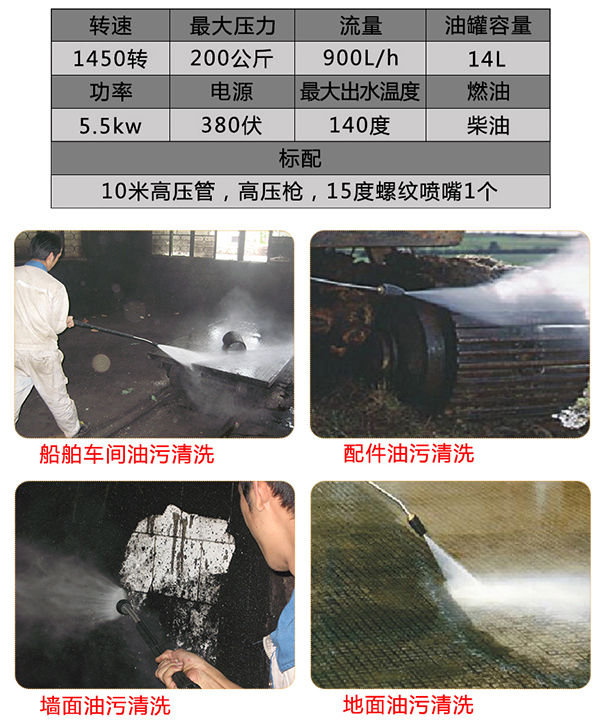 大中型冷热水高压清洗机,柴油加热温度可调节,冷热水可随意转换,工作压力可达200公斤,可连续热水高压清洗作业,每小时水流量900升,适合重型油污化工等工业清洗,提供一年免费服务。