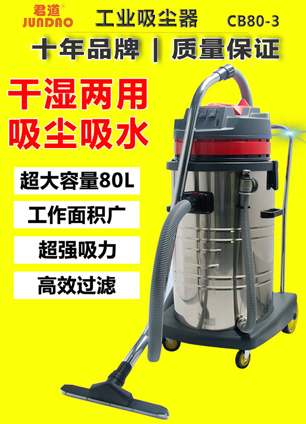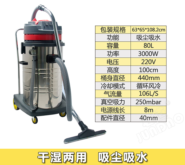 80升尘桶容量,不锈钢桶身坚固耐用,独立3马达配置,吸力强劲,适用于多种场所的吸尘吸水作业。