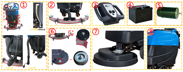 ⑧大水箱…保证长时间工作,大水箱设置,保证长时间工作。清水、污水箱内设有水量感应装置,有效保护马达,刷盘。
