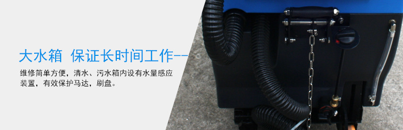 ⑧大水箱…保证长时间工作,大水箱设置,保证长时间工作。清水、污水箱内设有水量感应装置,有效保护马达,刷盘。