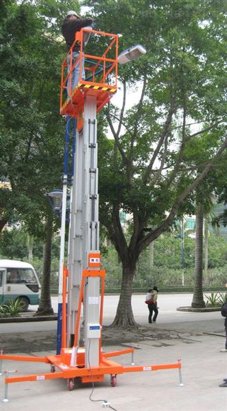 双人工作高空工作平台,采用双桅杆设计,工作空间更大,更安全,更稳固。工作高度更高。适用于各种礼堂天花维护,酒店物业管理。