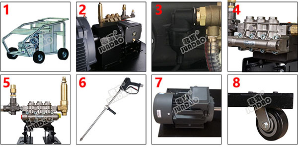 1.调压阀2.喷嘴3.漏电保护装置4.10米高压管5.工业级高压喷杆