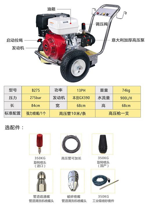 本田汽油发动机驱动,工作压力可调,da压力可达275公斤,使用寿命超长,本产品适合缺乏电源的地方工作,主要用港口、公路收费站、市政环卫、城市小广告的整治清洗等。