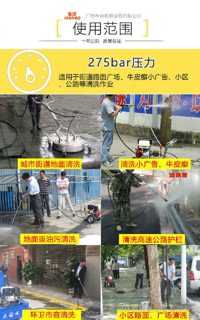 君道B275汽油高压清洗机,采用本田汽油发动机驱动,配备三缸陶瓷柱塞增压泵,工作压力可调,压力可达275公斤,使用寿命超长,本产品适合缺乏电源的地方工作。