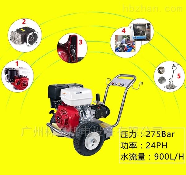 汽油高压清洗机,采用本田汽油发动机驱动,工作压力可调,压力可达275公斤,使用寿命超长,本产品适合缺乏电源的地方工作,君道牌B275移动式高压水清洗机,驱动动力采用本田GX390单缸汽油发动机,配备三缸陶瓷柱塞增压泵,清洗水流压力大小可以根据需要调整,动力单元可加注92号汽油节能高效,水流冲洗形状可变成直线或扇面形状清洗,配有4种钢制快捷清洗喷嘴,便于多种清洗工况要求,装有2个大轮胎自身移动轻便,也和装固在三轮车、电瓶车、或汽车上更便与长距离移动清洗,该机型上市进10年来,多用于矿山石、高速公路、机场跑道、收费站及城市市容环卫保洁清洗,因此也称小广告清洗机等,是真正意义上的移动式清洗设备。 适用于公路收费站、市政环卫、城市的整治清洗等。紧凑型坚固的机身,适合放置于车上;移动方便,方便户外清洁。