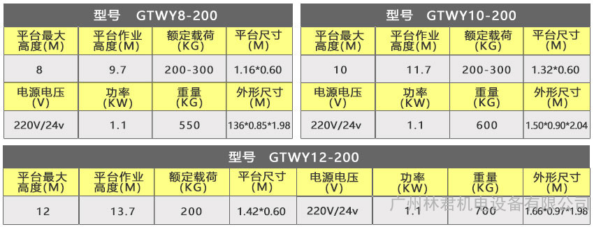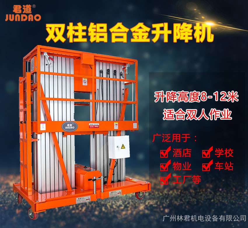 GTWY12-200双柱式升降机,双人工作铝合金升降机,工作高度可达13.7米,配有地面、平台两套操作按钮机围栏自动升降系统,方便使用操作。电动液压升降,升降柱采用双链条式高强度铝合金型材,安全可靠,升降平稳,无噪音,液压单元经久耐用,设备移动方便灵活。