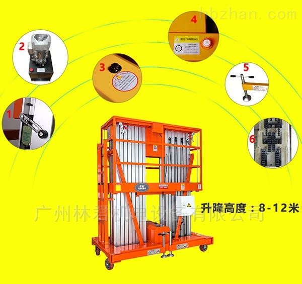 物业保洁双人工作12米双柱式升降机 ,GTWY12-200双柱式升降机,可双人工作的铝合金升降机,工作高度可达13.7米,配有地面、平台两套操作按钮机围栏自动升降系统,方便使用操作。电动液压升降,升降柱采用双链条式高强度铝合金型材,安全可靠,升降平稳,无噪音,液压单元经久耐用,设备移动方便灵活。